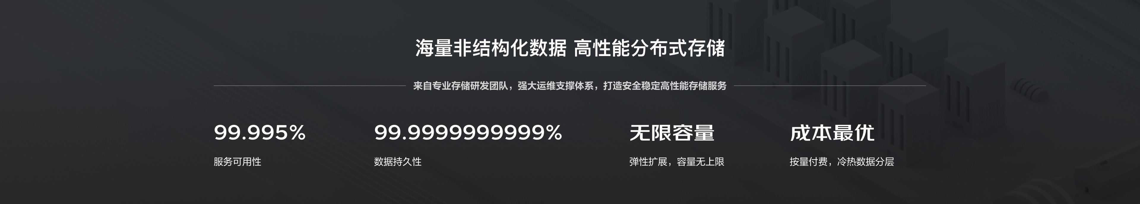 OSS 提供多重冗余架构数据存储,以及数据的智能调度和异地容灾部署,为您提供高达99.9999999999%(12个9)的数据可靠性和99.995%的服务可用性。